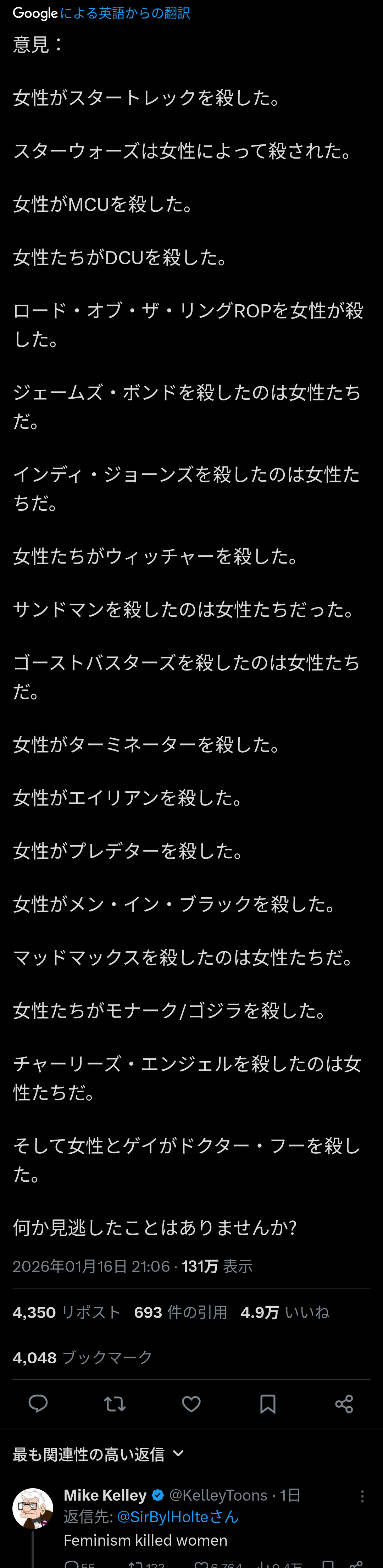 | … | 526/01/18(日)20:12:31No.1393761464そうだねx1>ターミネーターエイリアンは意味が違うくねえかな!? |
