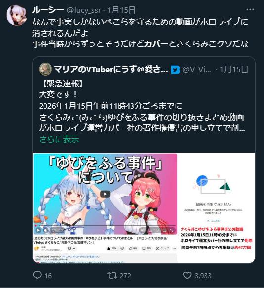 野うさぎ「なんで事実しかないぺこらを守る動画がホロライブに消されるんだよ」
