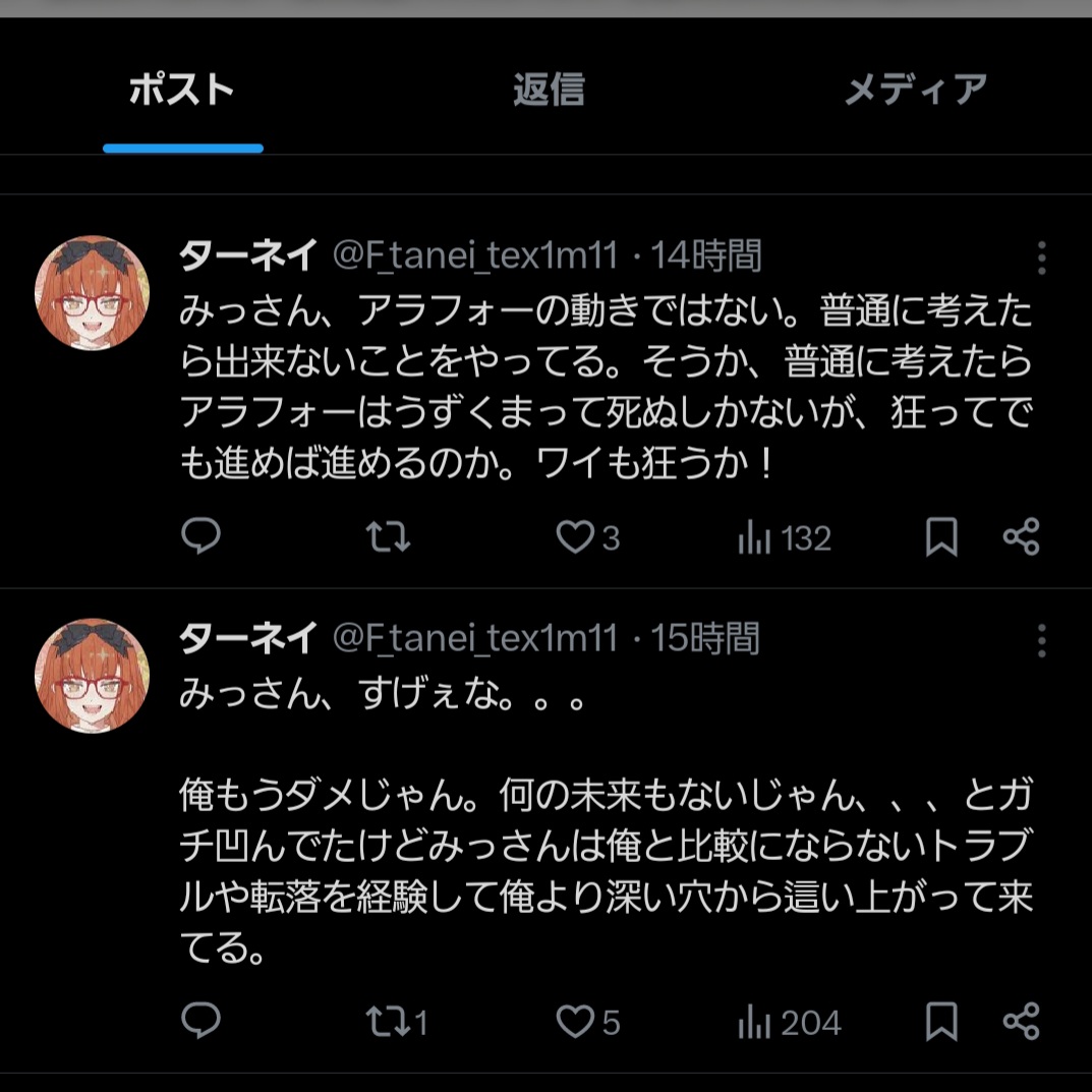 | … | 29626/01/19(月)12:09:55No.1393936581そうだねx1>イジメどうこう言うならストレートに配信でライバーたちにイジメられたから辞めるって言った人の発言を広めてあげたらいいのに… |