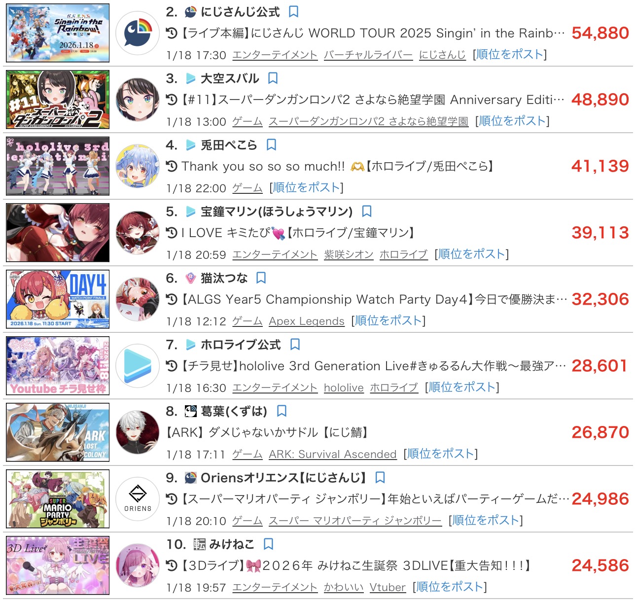 | … | 13626/01/19(月)13:19:53No.1393956287そうだねx6>わざわざ1位避けてにじさんじトップに見せるの恥ずかしくないの |