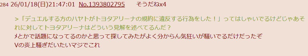 | … | 226/01/19(月)12:13:11No.1393937473そうだねx32ライブでトヨタアリーナの規約違反するにじさんじ恥ずかしくないの? |