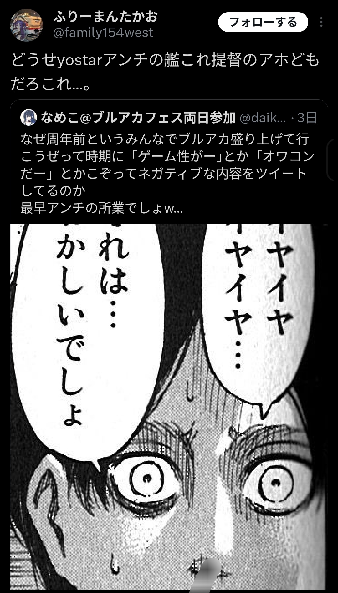 | … | 87326/01/19(月)14:22:13No.1393969548+>Xだとブルアカをチラチラ見ながら中傷してんのウマ娘アイコンばっかなのに提督を盾にすんの無理があるだろ |