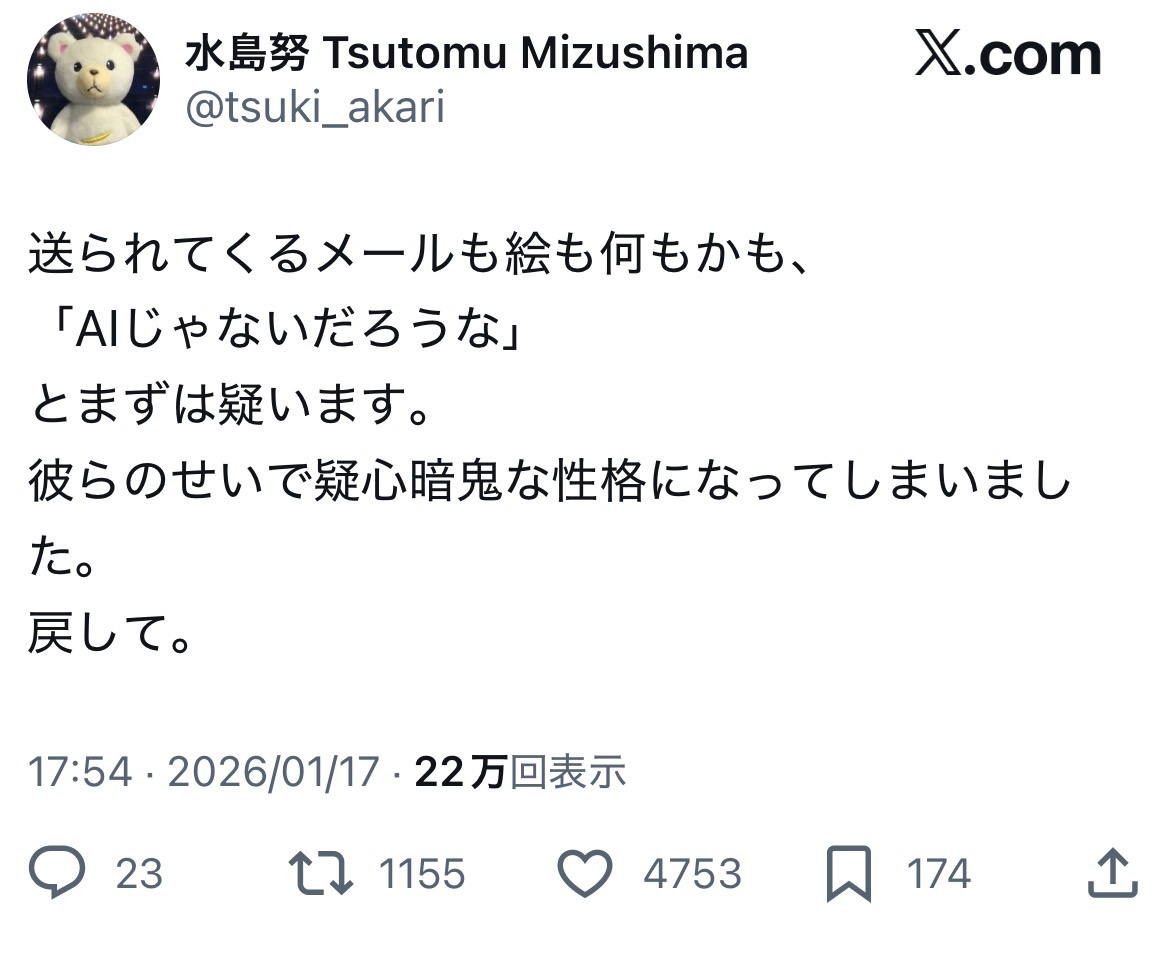 | … | 4026/01/19(月)11:53:42No.1393932713+外国の反AIはもはや宗教レベルに到達してるのがすごい |