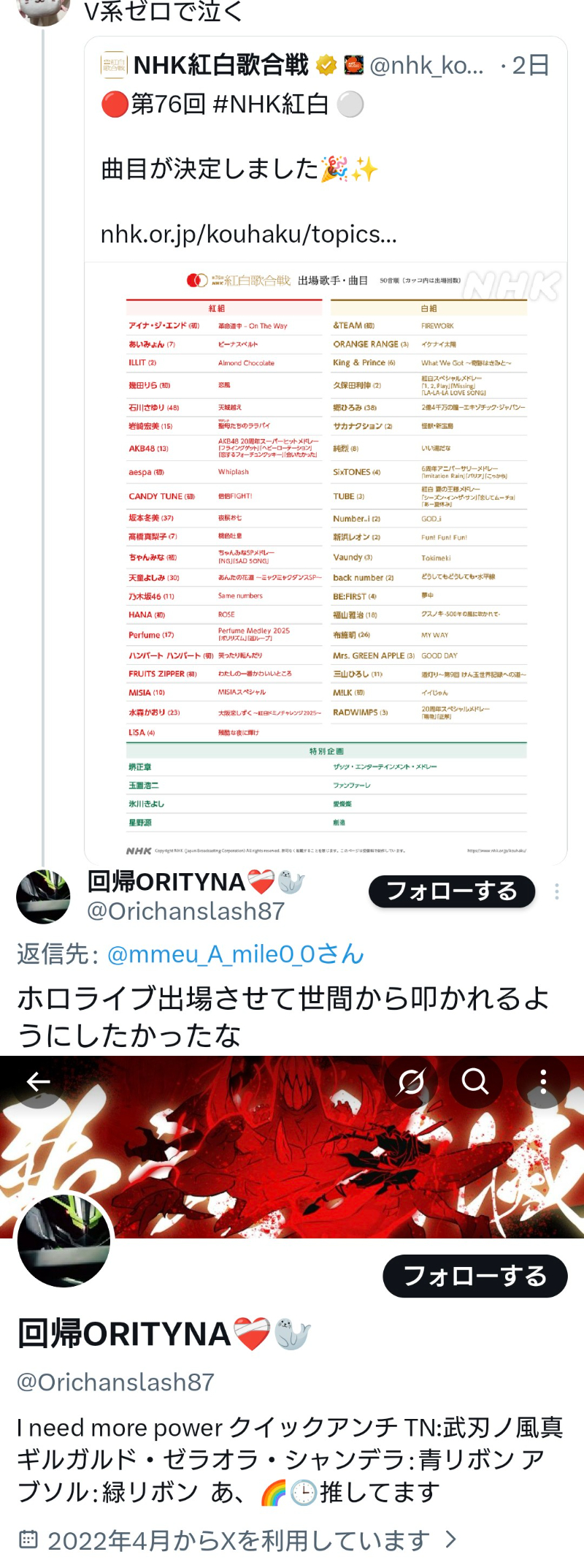 | … | 22826/01/19(月)15:26:00No.1393983266+>>にじが強いのは男性ライバーだからヒーローあたりと比べよう |