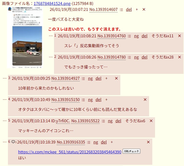 | … | 826/01/19(月)18:15:16 ID:.isbM3PgNo.1394020882+https://x.com/mckee_561/status/2012683203845464390 |