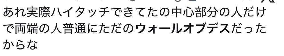 | … | 18626/01/19(月)20:46:56No.1394075695そうだねx5>実際にはハイタッチじゃなくてウォールオブデスも行われてたけど |
