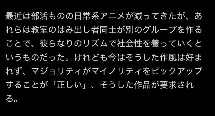 | … | 18726/01/19(月)21:28:22No.1394093443+>マイノリティの部が部員以外に蔑まれてる描写を日常系アニメで見たことない |