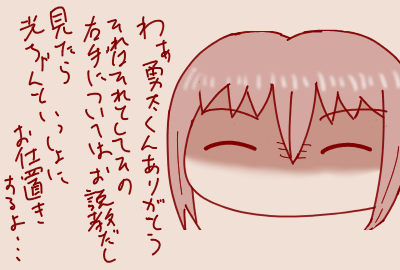 | … | 4326/01/20(火)02:38:12 ID:S1FWrdPQNo.1394180374+私は怒ってないよ?くろーさんが無理するのはいつものことだもんね。だからさっきお兄ちゃんにもくろーさんの話しておいたよ。 |