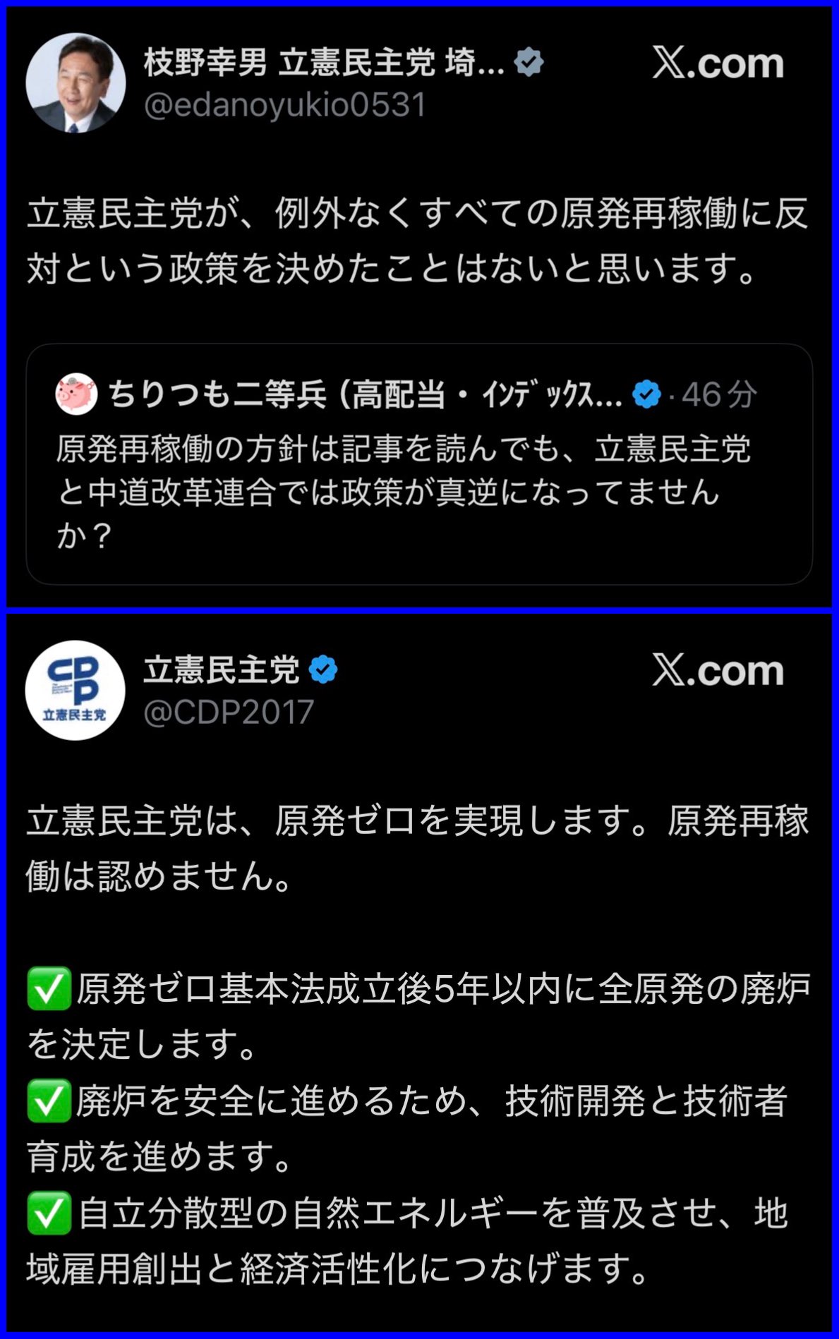 | … | 23126/01/20(火)10:01:28No.1394211194+立憲コア層って原発アンチだと思うんだがそれでも立憲に票いれるのかな |