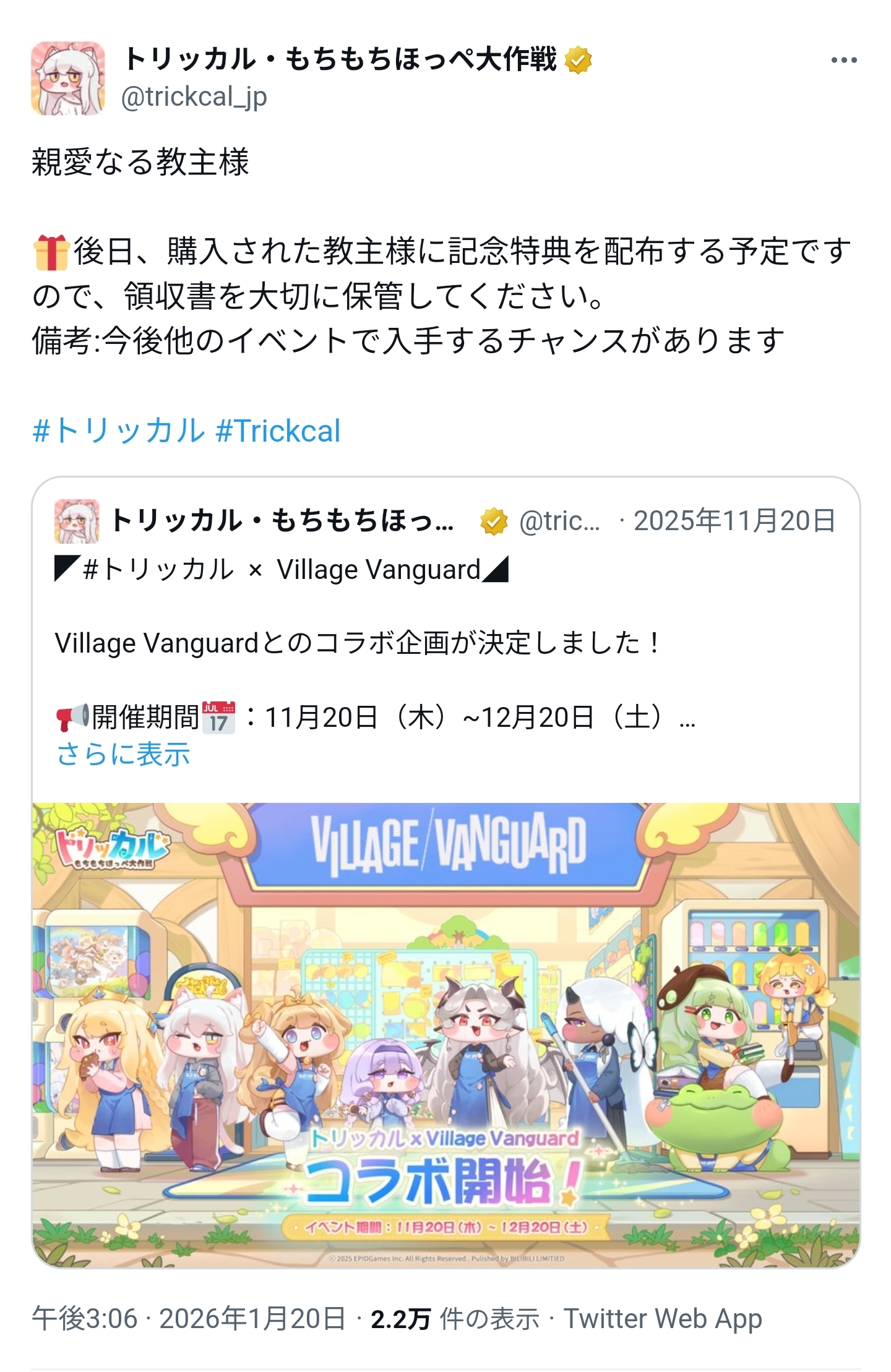 | … | 1726/01/20(火)15:29:22 ID:aguDybQENo.1394276281+https://x.com/trickcal_jp/status/2013493270438125828 |
