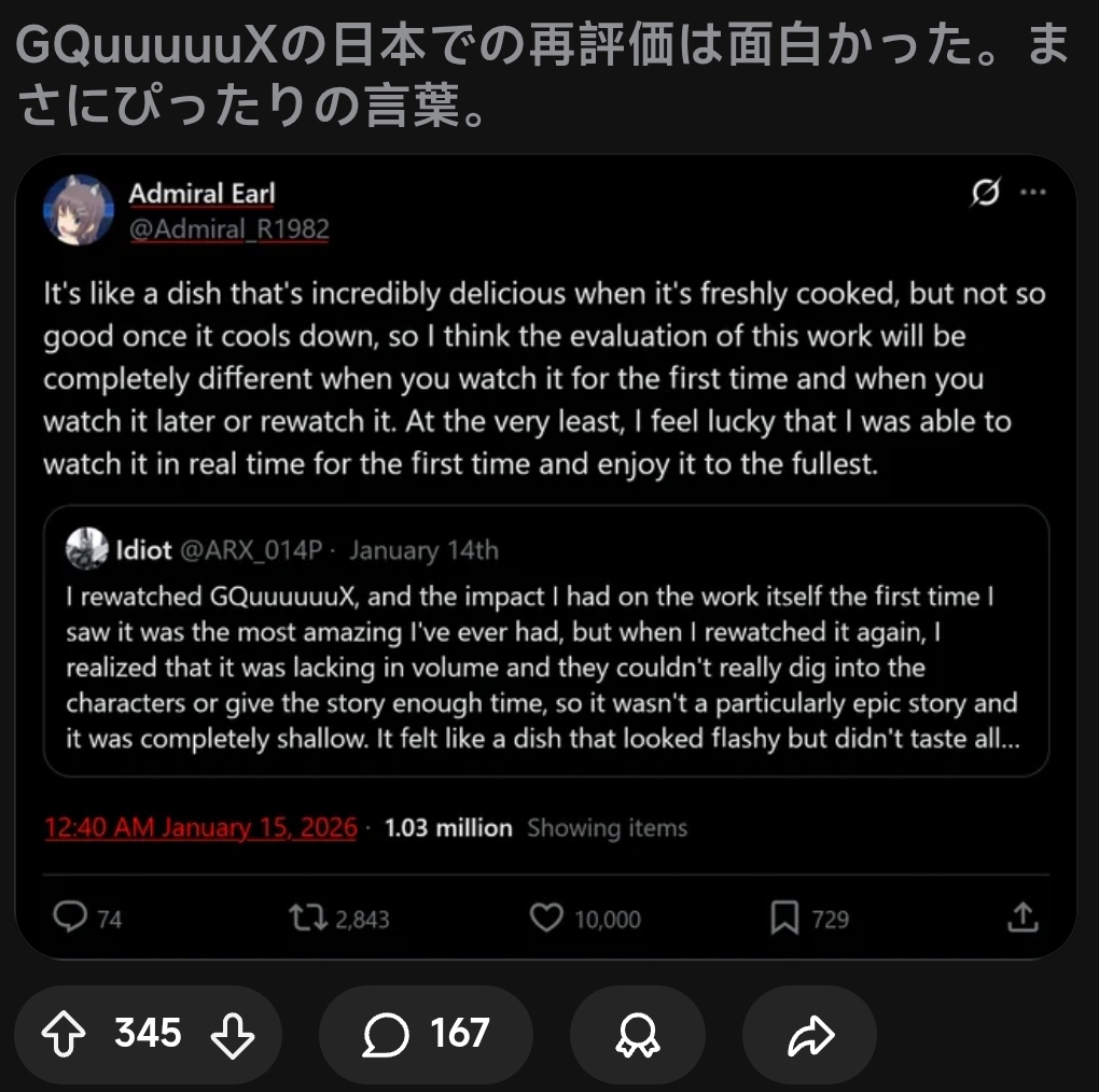 ジークアクス冷めた料理理論が海外でも話題になってるアンチか?このスレは古いので、もうすぐ消えます。