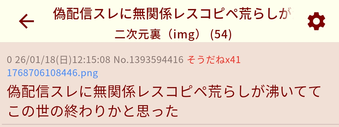 | … | 1026/01/20(火)14:12:55No.1394260917+無差別にコピペしてるから基本レスがつかない偽配信スレが目立つんじゃないの |