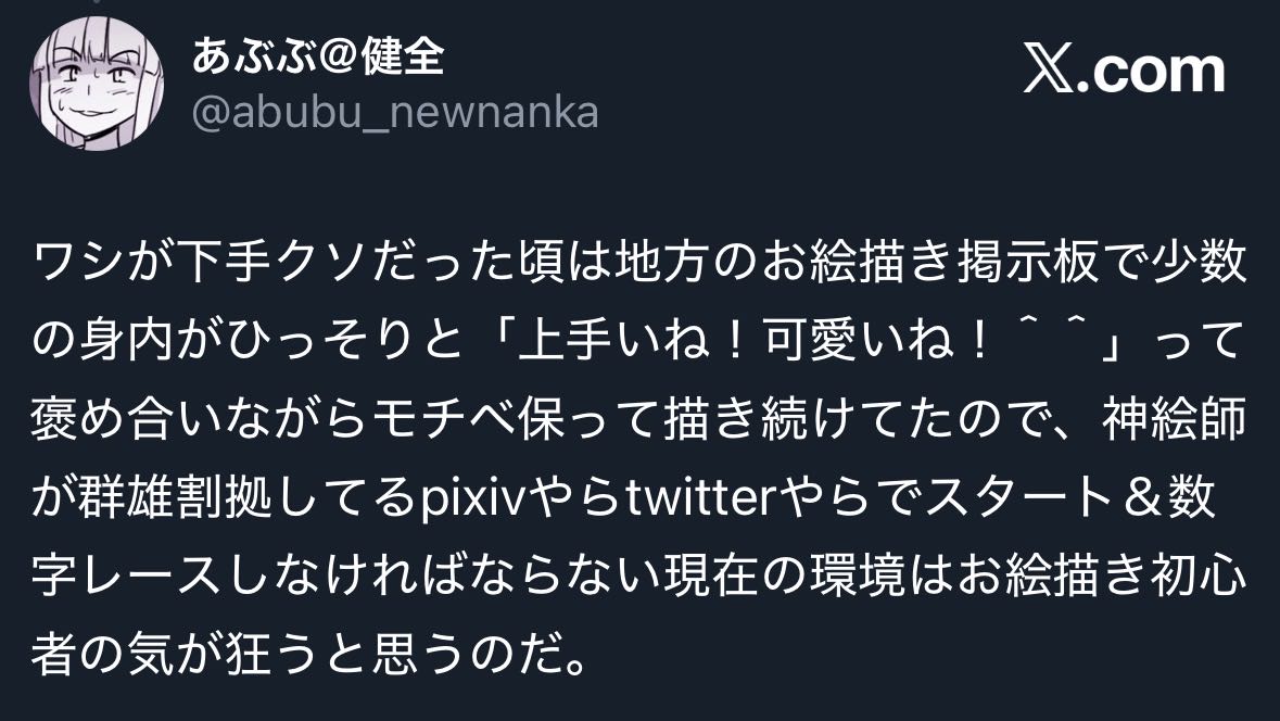 | … | 4726/01/20(火)15:12:34No.1394272480そうだねx2最近イラスト描き始めてXに投稿してるけど原作者の方とかVtuberとかにいいね貰えるとモチベ上がるから悪くない環境だと思ってる |