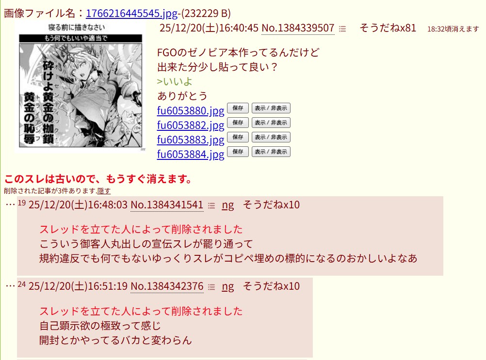 | … | 11326/01/20(火)20:00:23No.1394344666+書き込みをした人によって削除されました |