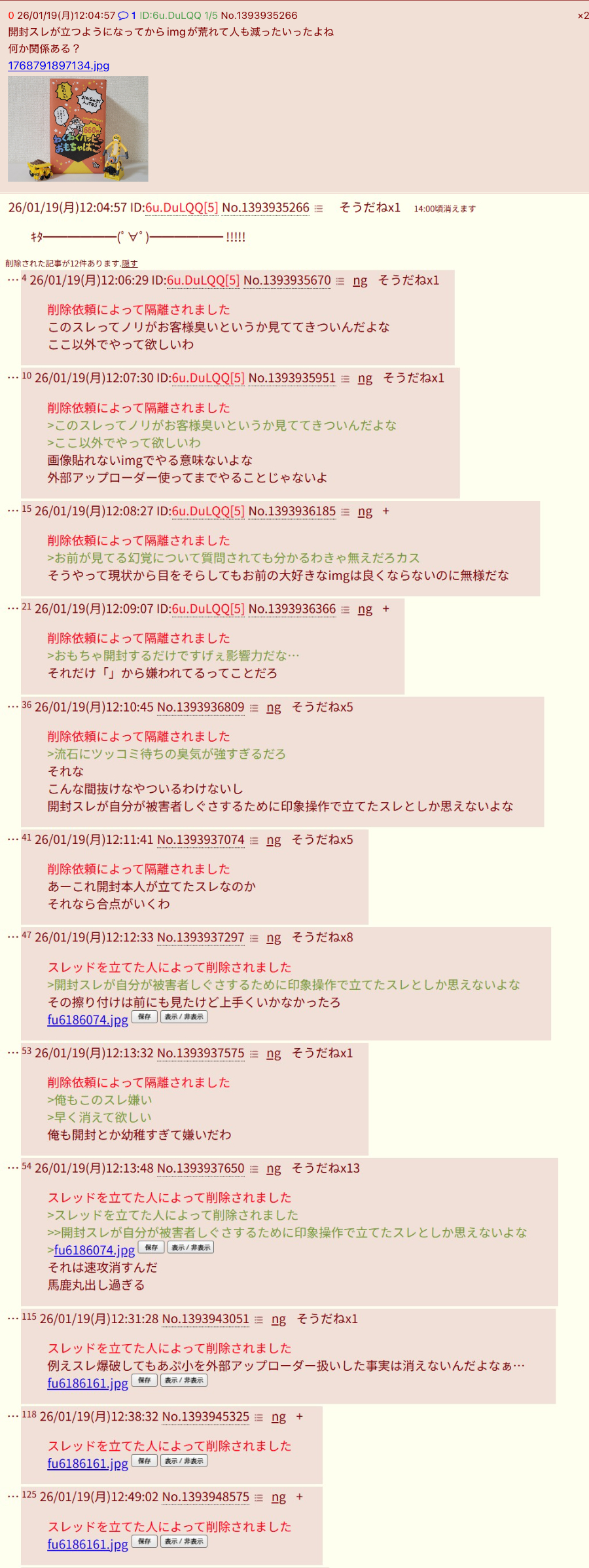 | … | 526/01/20(火)19:32:47No.1394335443そうだねx38>Vのスレもゲームやアニメのスレもコピペ被害でまともに機能してないし今imgで唯一まともなスレって開封スレくらいだよね |