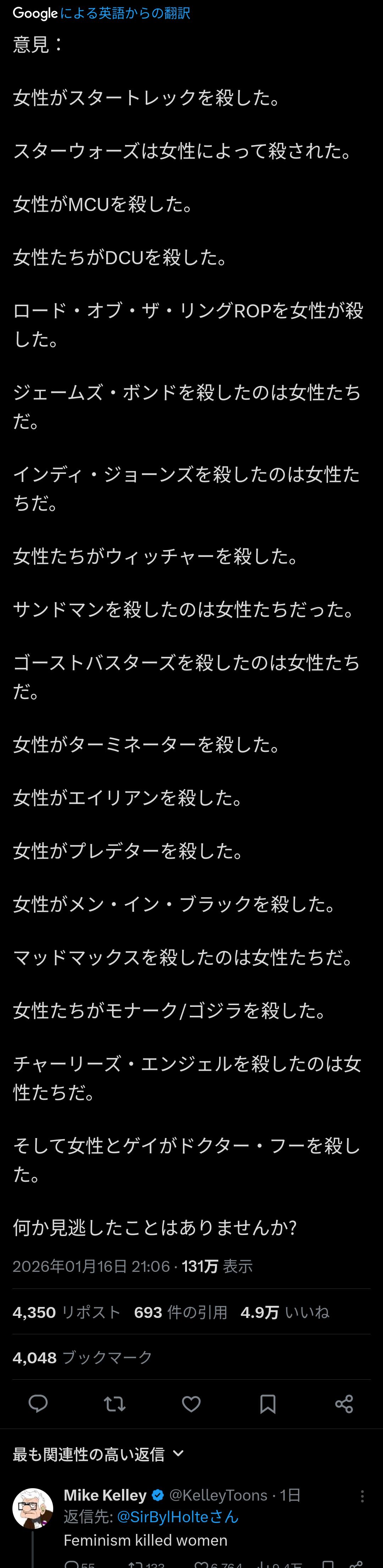 | … | 2426/01/20(火)21:02:44No.1394367053そうだねx4>女性がエイリアンを殺したってもしかしてリプリーのこと言ってる…? |