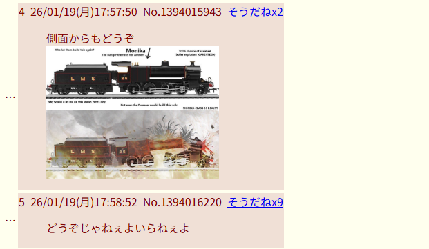 | … | 4126/01/20(火)23:50:07No.1394428424+理解するには普段から蒸気機関車に対してよくない目で見てるぐらいのベースラインが必要だと思う |