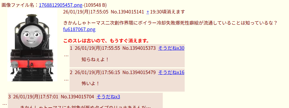 | … | 2826/01/20(火)23:29:44No.1394421694+>何って…きかんしゃトーマスがボイラー冷却できなくて爆死する性癖だが? |
