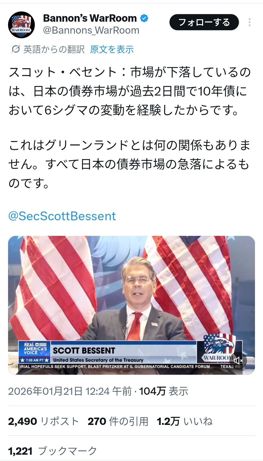 | … | 13526/01/21(水)12:16:49No.1394513654そうだねx1>べセント「アメリカの市場が混乱してるのは日本のせい |