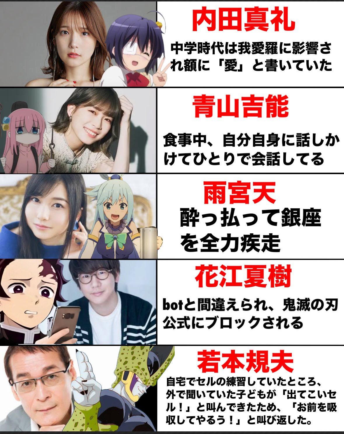 | … | 5326/01/21(水)12:10:25No.1394511903+>若本さんのやつはあの時代の他の国民的アニメ声優大体似たようなエピソードあるんだよな |