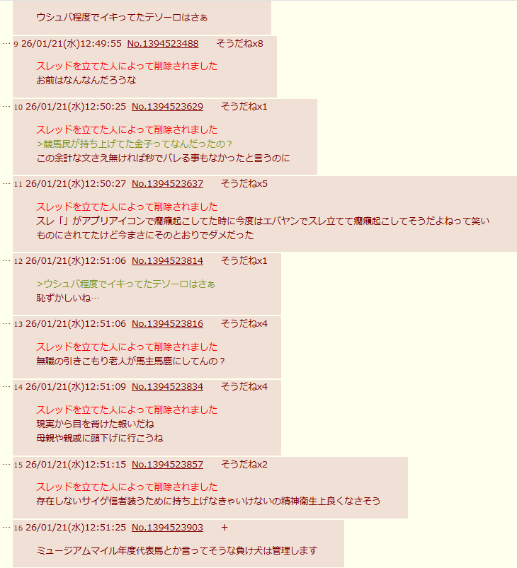| … | 10526/01/21(水)13:32:16No.1394533217そうだねx16>ウマガイジくせえきっしょいスレ |
