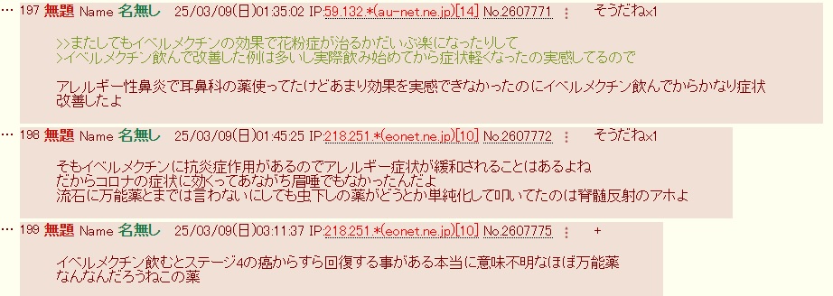 | … | 29026/01/21(水)16:23:47No.1394564761+>やっぱ標準治療じゃなくて民間治療で治すのかな…早速犬用の駆虫薬が効いたってリプ付いてて笑っちゃった |