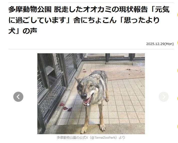 | … | 8226/01/21(水)16:36:51No.1394567223+脱走した狼だけど嫁が治療で別室に行ったから探しに脱走したという |