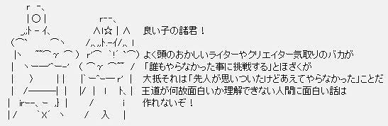 | … | 90426/01/21(水)17:21:43No.1394576320+>漫画家に自由に描かせたらどっかでみたようなものしか描けない |