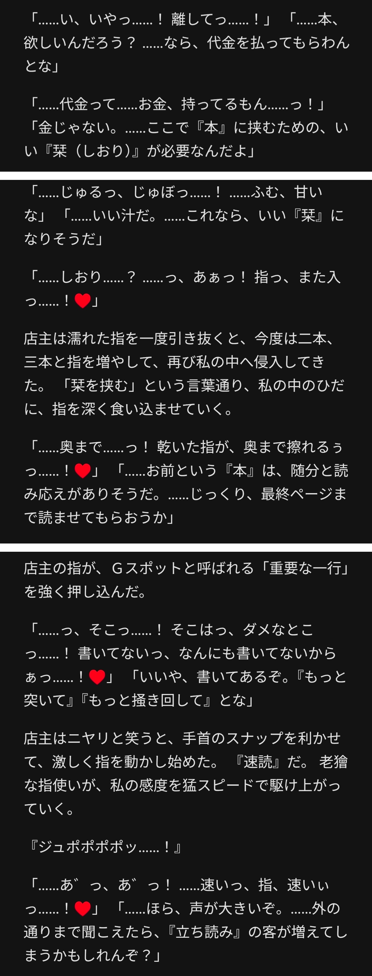 | … | 23426/01/21(水)18:36:38No.1394595736+露出物書かせてて途中からバレる展開に進めてたんだけど本屋でバレて店主に手出される流れで女の子の身体とかをいちいち本に例えて表現してきてちょっと笑ってしまった |