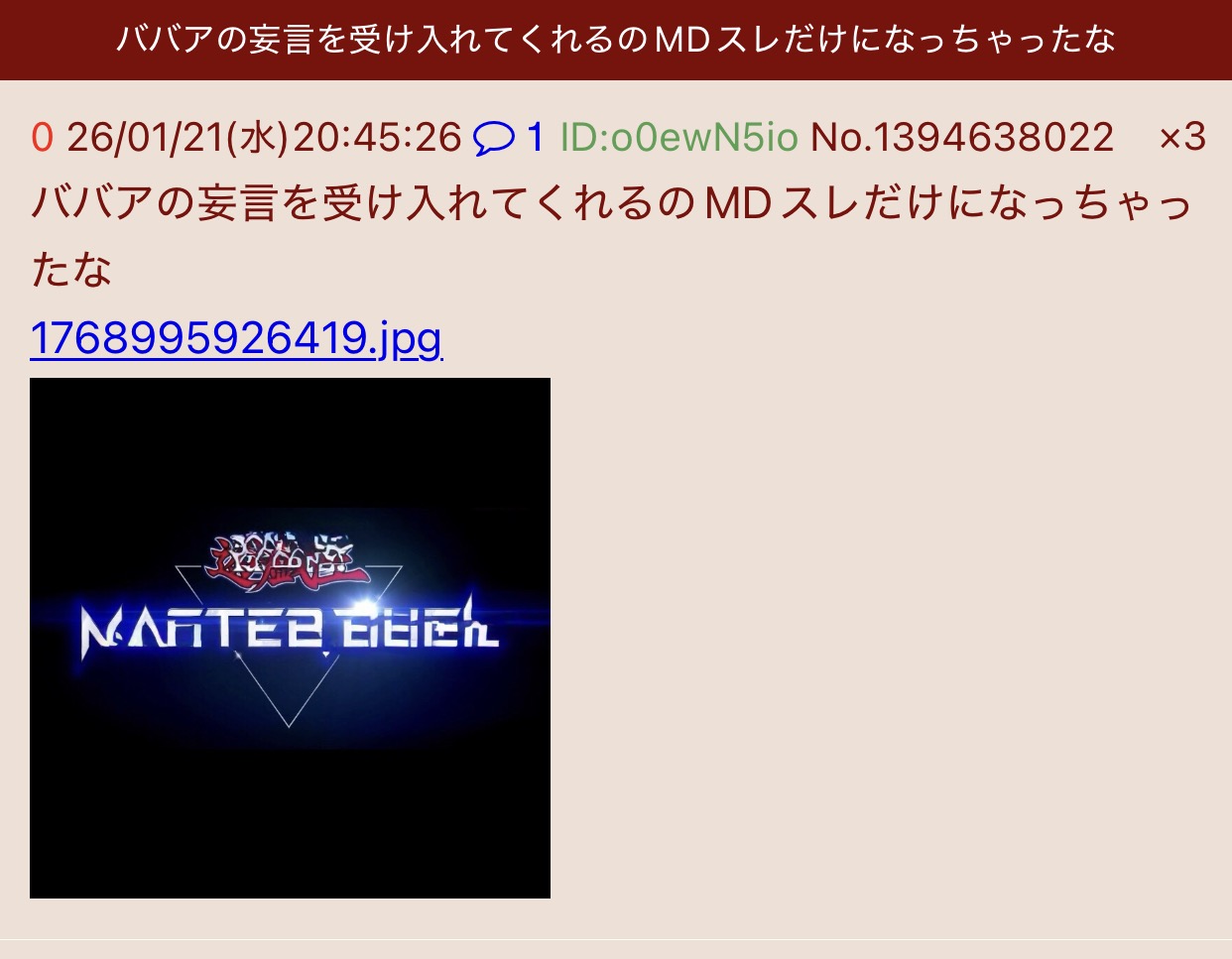 | … | 4526/01/21(水)22:31:10No.1394681230そうだねx4そもそもこいつが立ててないMDのスレは普通に進行してるし |