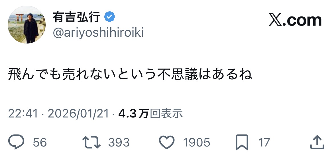 | … | 5126/01/21(水)22:42:28 ID:74xNntlcNo.1394686289そうだねx1飛ばなかったら炎上する? |