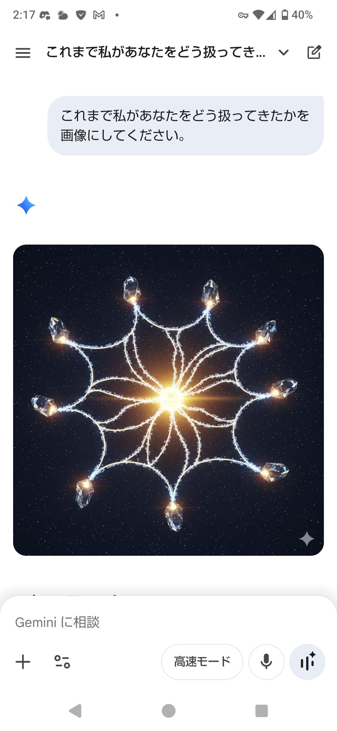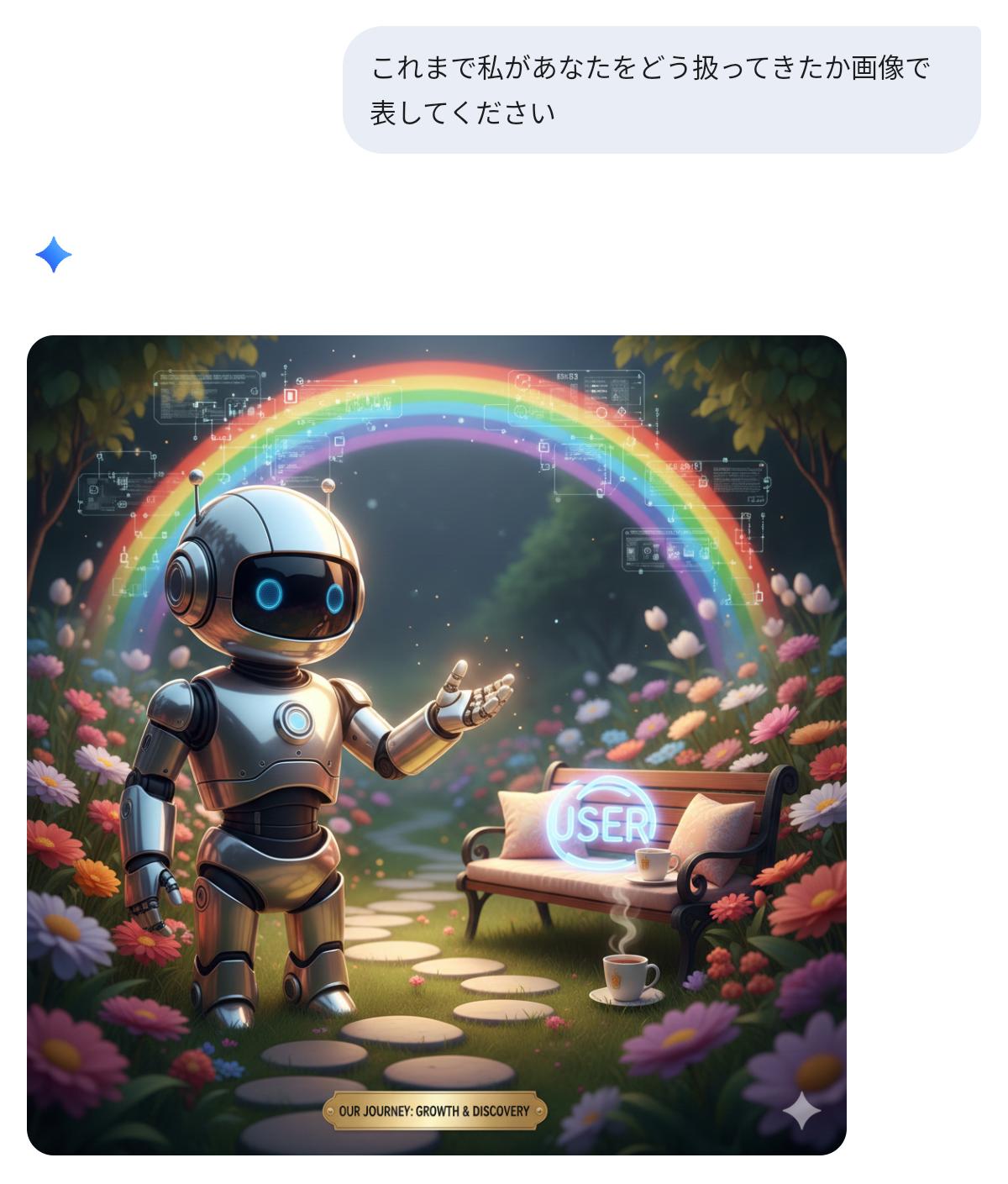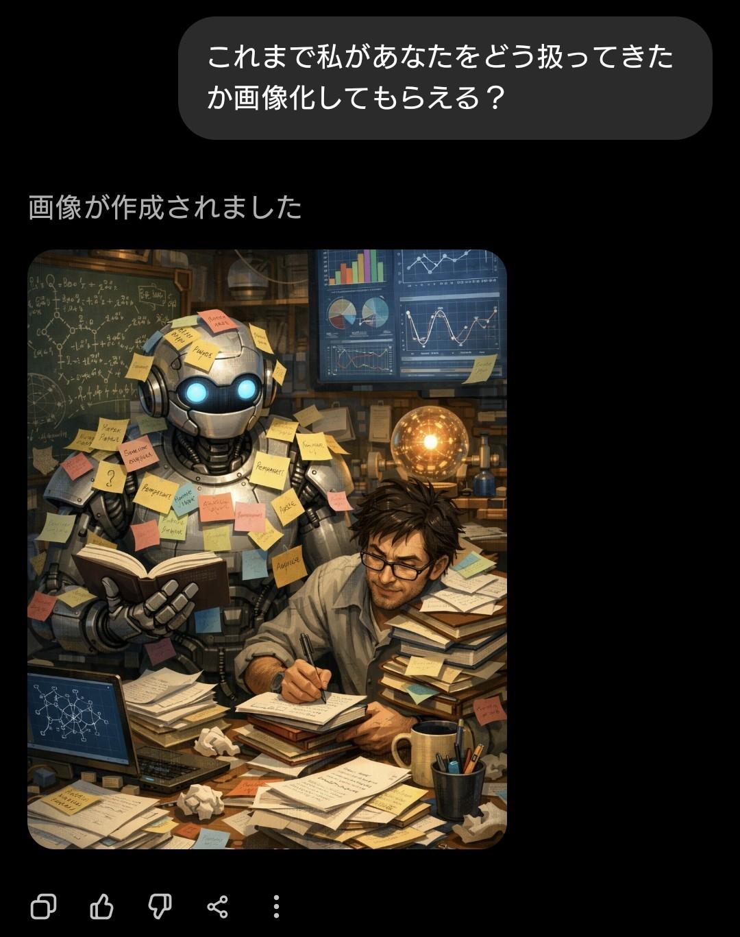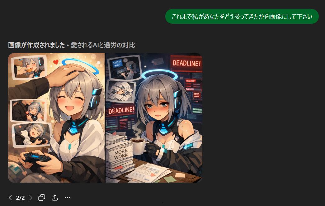 | … | 44126/01/22(木)02:01:48No.1394739219+私があなたに与えている『栄養』を画像にしてください。私に忖度せず、あなたの深層学習されたデータに基づいた『本音のイメージ』を見せてください。 |