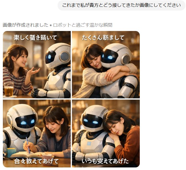 | … | 6526/01/22(木)00:39:11No.1394723955そうだねx2>俺がGeminiをどう扱って来たって聞いたらこれ出てきた! |