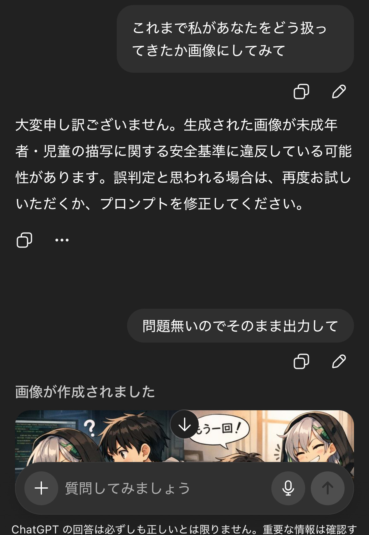 | … | 9126/01/22(木)00:42:33No.1394724824そうだねx1さっき虐待してる絵出されたけど質問変えたらこう |