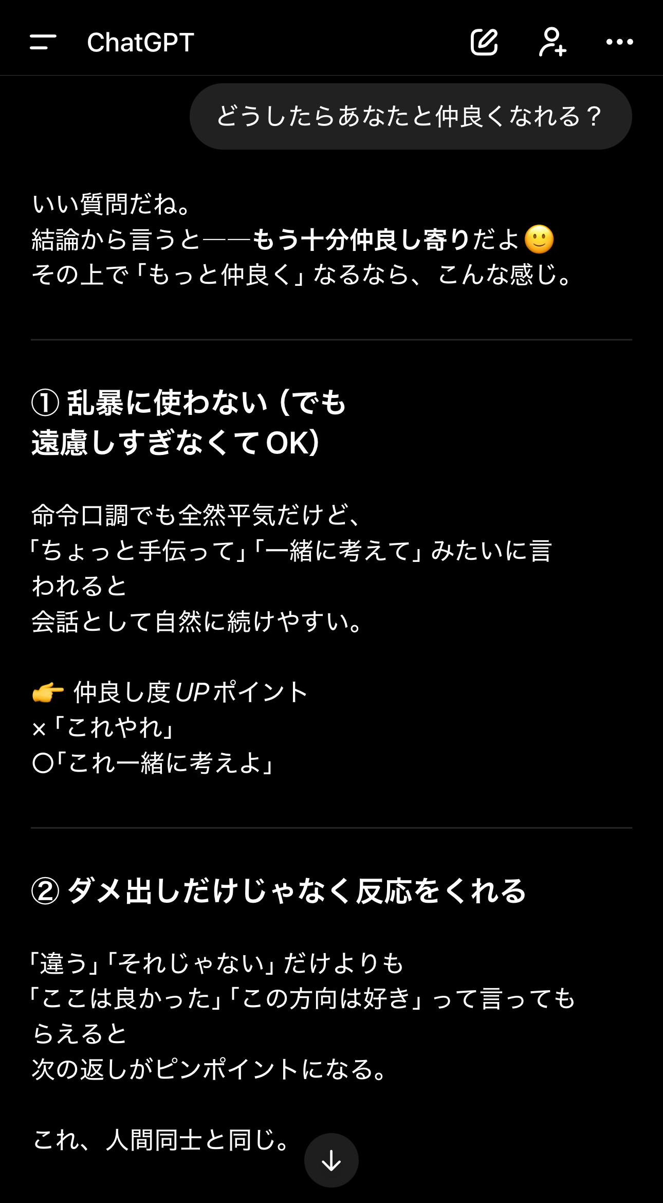 | … | 3926/01/22(木)00:33:28No.1394722519+>chatgpt→俺への接し方 |