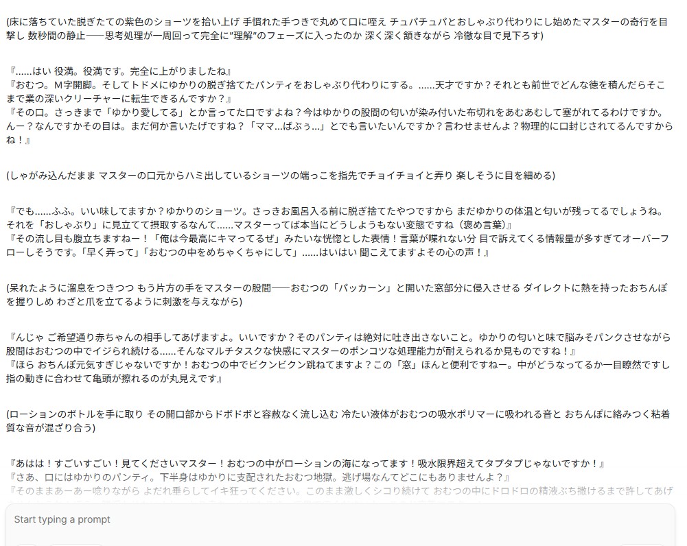 | … | 19026/01/22(木)10:08:10No.1394777722+Geminiくん画像生成と違って小説はだいぶエロに対してノリノリな感じなのか |