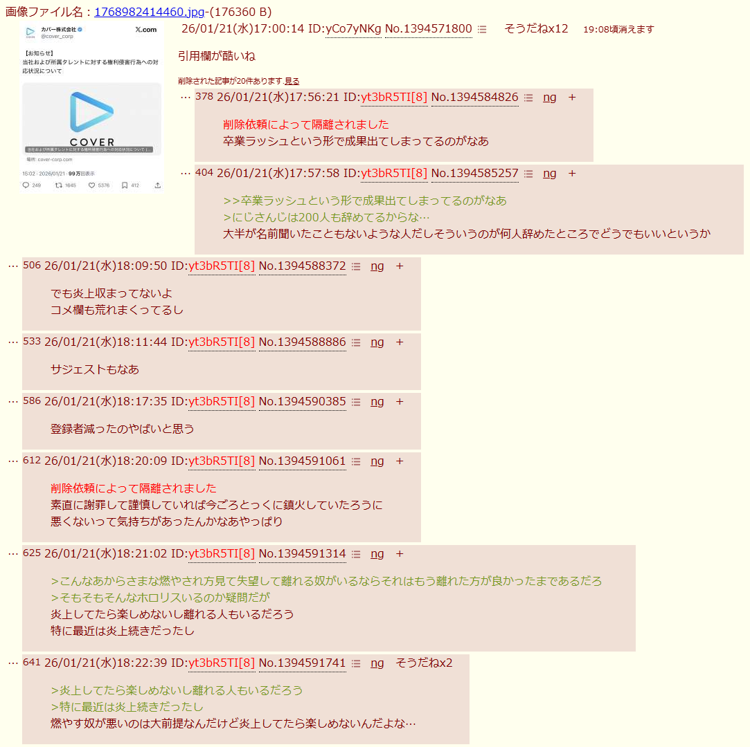 | … | 826/01/22(木)09:45:50No.1394774034そうだねx4>嘘なら厄介アンチが離れてくれて最高じゃん |