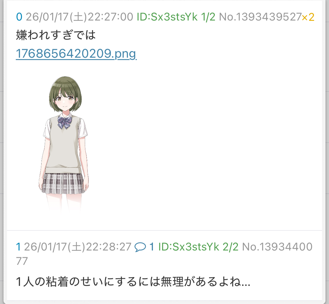 | … | 1526/01/22(木)11:50:01No.1394795239そうだねx10>1人が嫌ってることにするのは無理があるよ… |