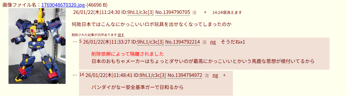 | … | 7026/01/22(木)12:54:55No.1394813062+>何故日本ではこんなにかっこいいロボ玩具を出せなくなってしまったのか |