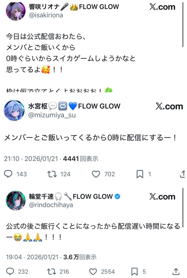| … | 2426/01/22(木)13:34:39No.1394822262+水宮もこの後9時半から配信あるから誘うの難しかったて言ってるしな |