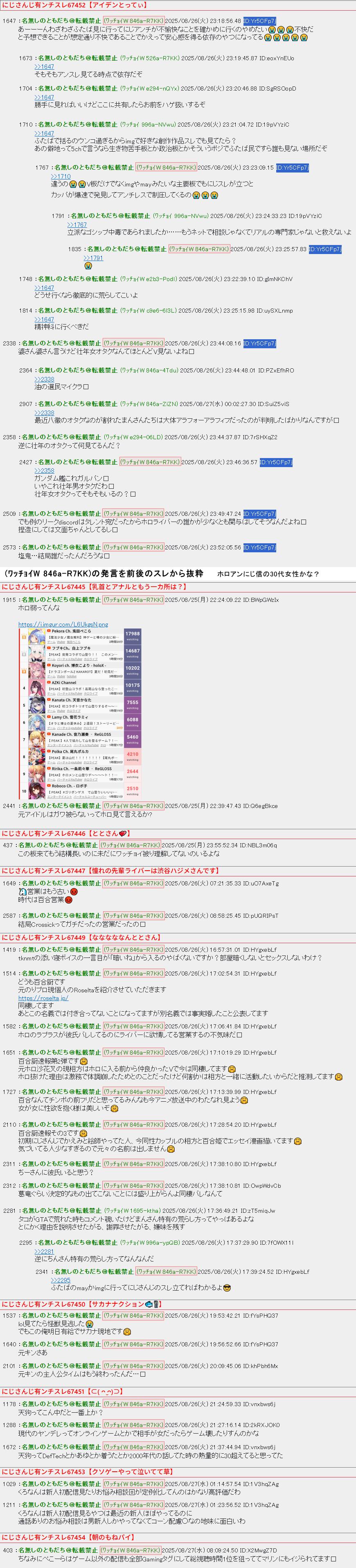 | … | 8326/01/22(木)14:28:08No.1394832307+ホロ粘着は全部捏造だけどにじさんじのやらかしはどれもソースあるしなぁ |
