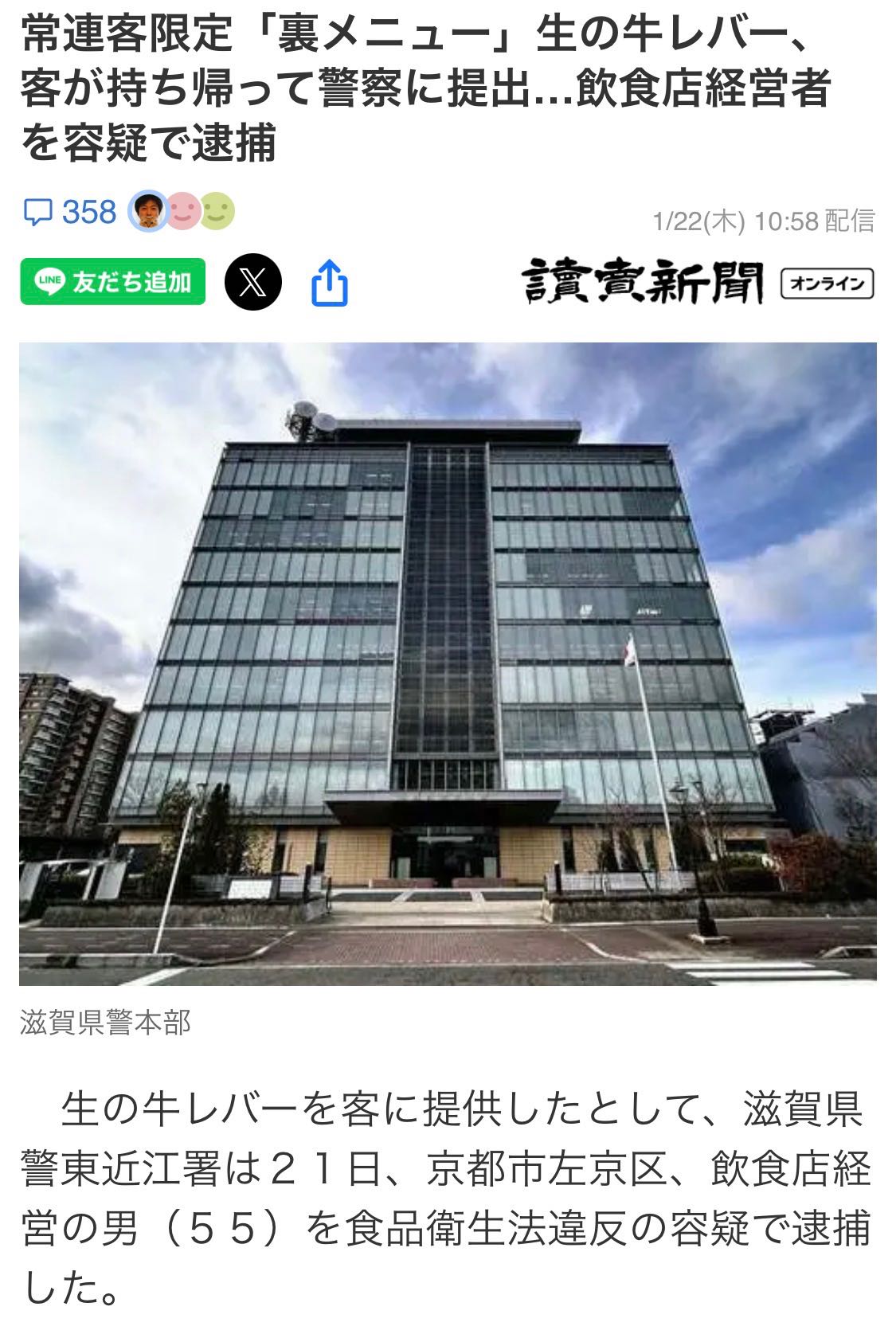 | … | 1426/01/22(木)15:13:22No.1394840594+生の牛レバーを客に提供したとして、滋賀県警東近江署は21日、京都市左京区、飲食店経営の男(55)を食品衛生法違反の容疑で逮捕した。 |
