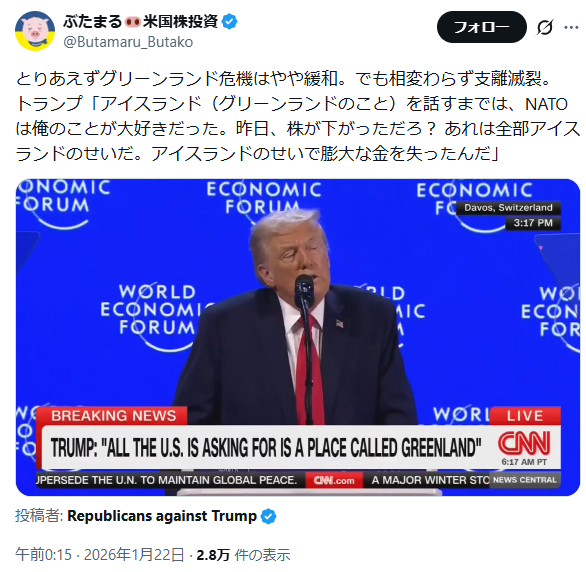 | … | 1026/01/22(木)16:14:12No.1394852565そうだねx9昨日は株が下がったのは日本が悪いって言ってたのに… |