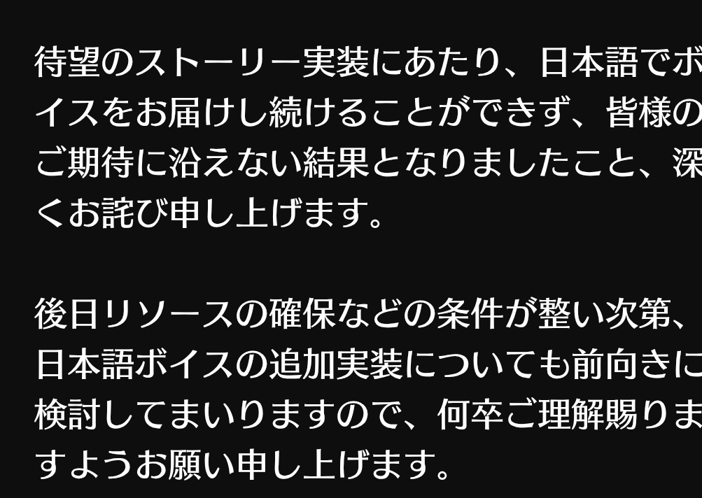 | … | 15926/01/22(木)18:40:50 ID:dt2LzarYNo.1394885258そうだねx1>来シーズンからは日本語ボイスなし… |