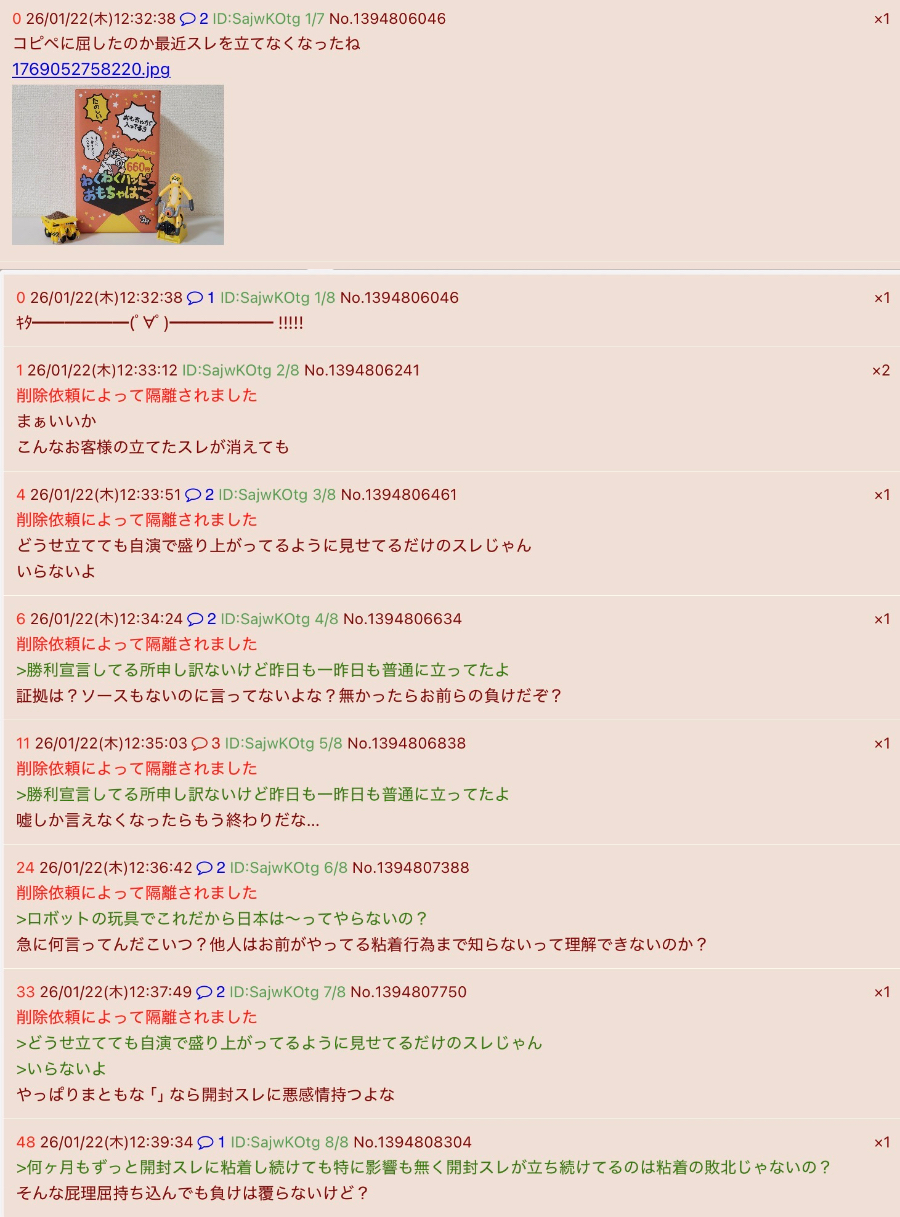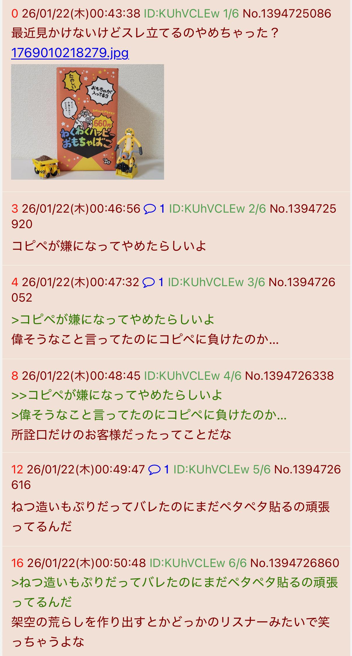 | … | 126/01/22(木)18:18:45No.1394879647そうだねx13キチガイの起床時間って感じのスレ立て |
