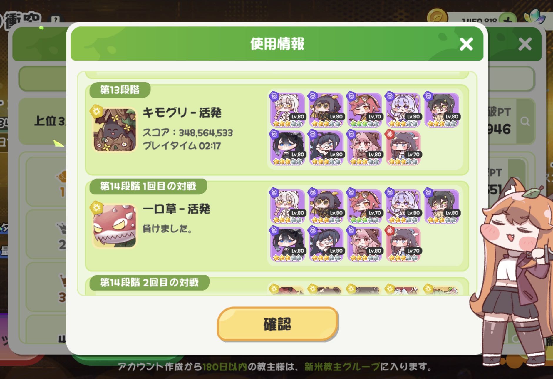 | … | 41226/01/22(木)22:27:42 ID:Zi7PPf3.No.1394957805+「」ミーは完全無課金でヨミいなくて全く石割ってなくても進軍26クリアできたにゃん |
