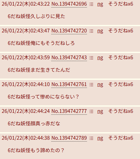 | … | 226/01/22(木)22:08:20No.1394951668そうだねx1710だね妖怪は知ってるけど6だねなんているんだ… |