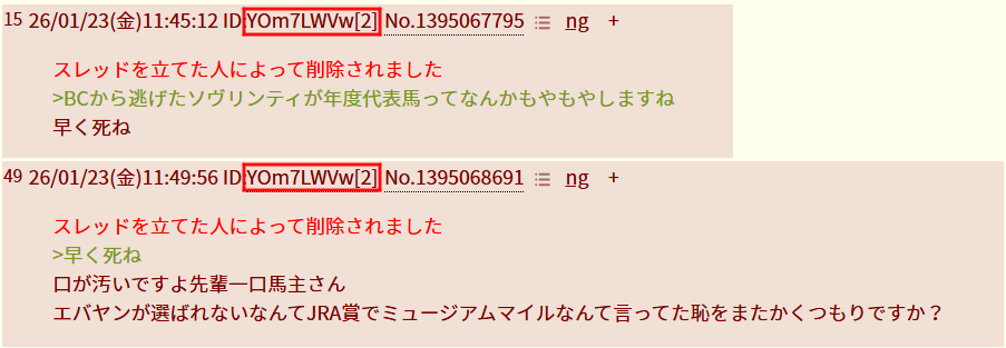 | … | 8326/01/23(金)13:48:37No.1395097340+ジェンティルへのアンチとも言いづらいこのキチガイさ |