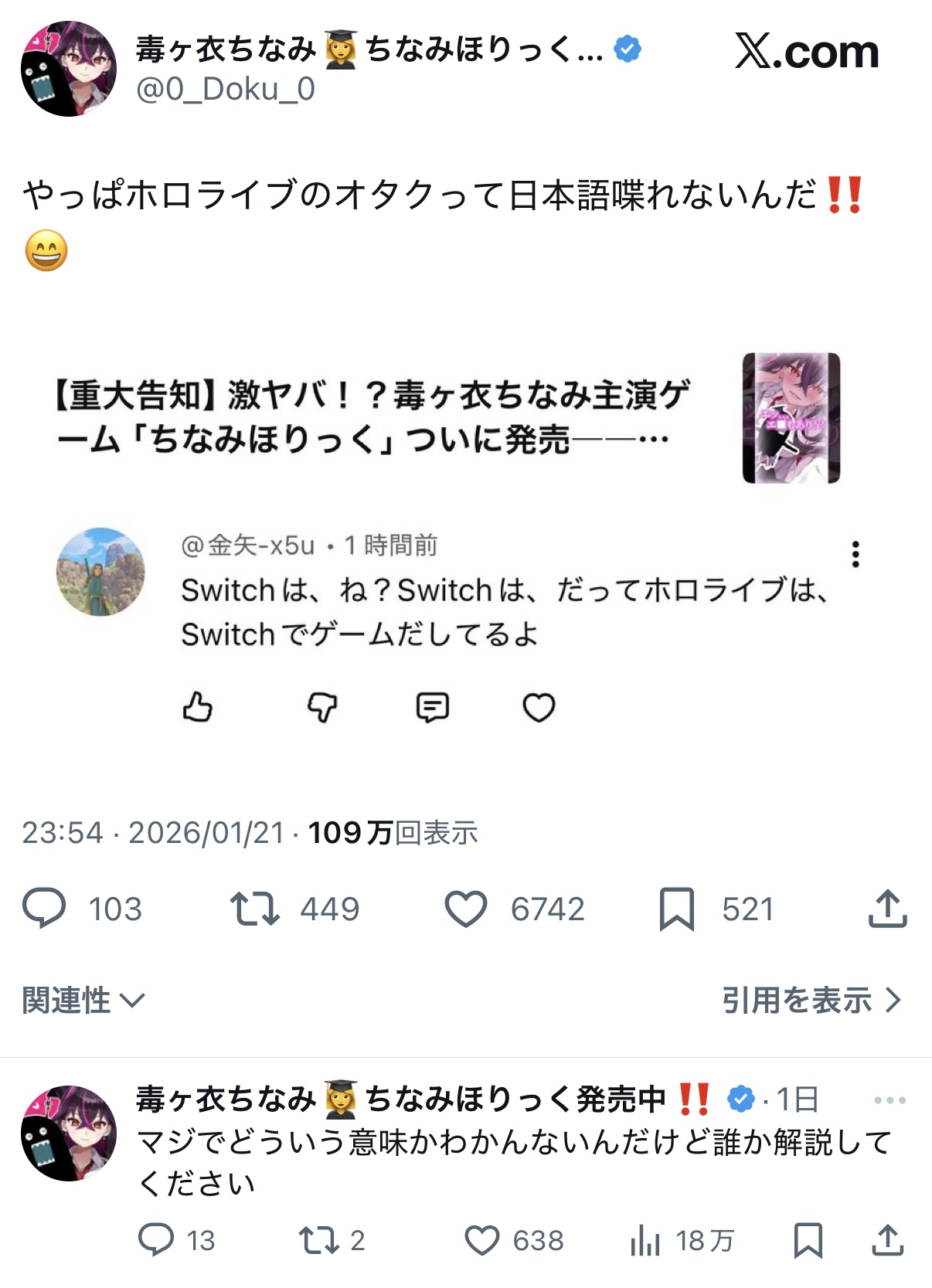 | … | 726/01/23(金)12:46:23No.1395083064+本人が相手から喧嘩を売られてる認識=「ホロライブ」は悪い意味で言及されてる認識のはずなのに |