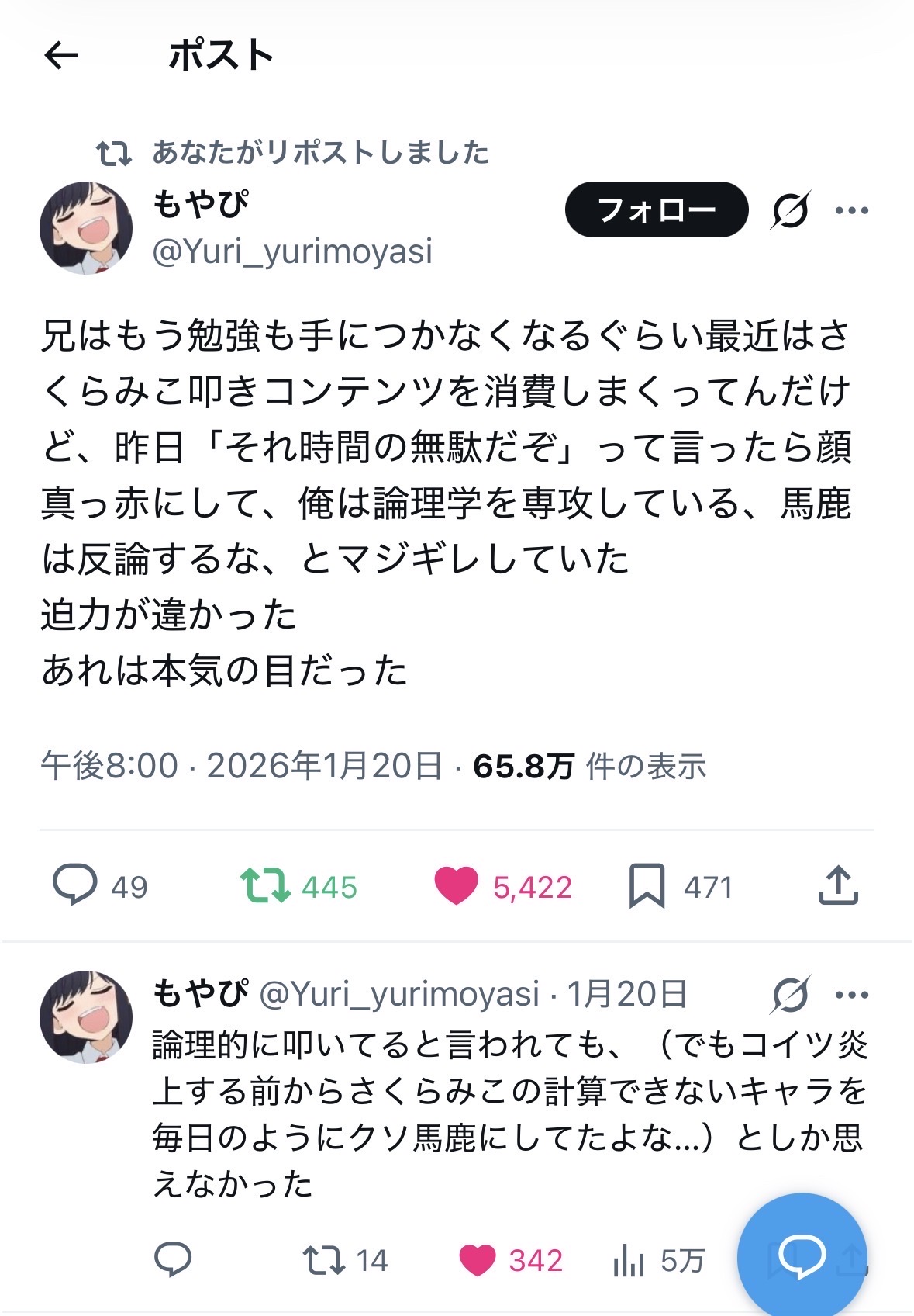 | … | 6226/01/23(金)19:58:29No.1395186865そうだねx7>共テ直後に妹に長時間キレ散らかしてる場合か一分一秒が惜しい時期だろ多浪マン |